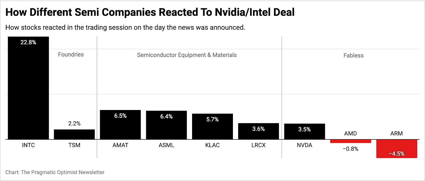Previously, we mentioned implications of the deal extending beyond the usual suspects, Nvidia and Intel. In the chart below, we show the market's response to certain semi stocks on the day the news was released.